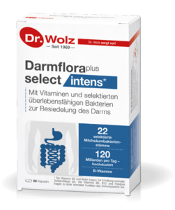 Rendkívül magas számú 22 törzset speciális tejsavbaktérium-tenyészettel, pontosan beállított napi rekord számú 120 milliárd adagban, valamint B2-, B6-, B12-vitaminokban, biotinban és folsavban.Egy nagy dózisú tejsavbaktérium készítmény a vékony- és vastagbél számára támogatást nyújt. Darmflóra plus select intenzív Dr Wolz-tól egy nagyon magas minőségű étrend-kiegészítő tejsavbaktériumokkal és válogatott vitaminokkal a bélnyálkahártya,és az immunrendszer támogatásáért