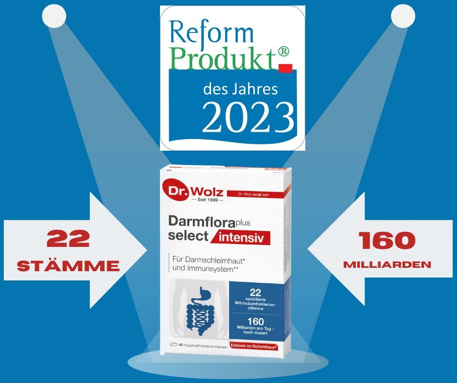 Míg tavaly a Darmflora plus select intens megkapta az "Év Gyógyszertári Terméke" díjat,addig a Darmflora plus select intenzív változata.A Reformhaus Fachaakademie által választott 2023-as év terméke" címet választották. Mind a gyógyszerész zsűrit,mind a Reformhaus-Fachakademie Alapítvány táplálkozási szakértőit nemcsak a magas adagolás, hanem mindenekelőtt a tanulmányokban tesztelt,kiváló minőségű törzsek tudományosan megalapozott kiválasztása nyűgözte le.